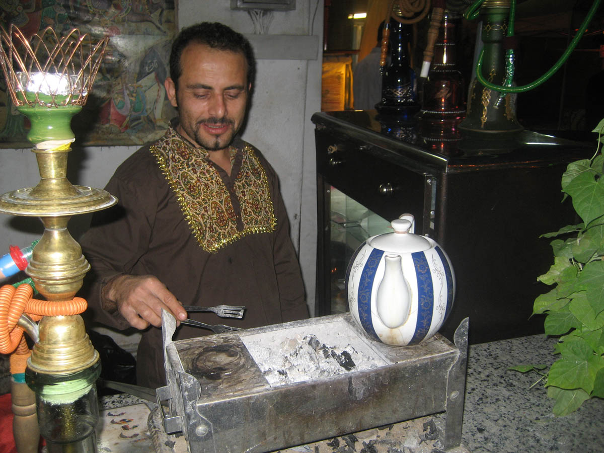 The charcoal pit is used for keeping the tea warm, and igniting the qalyan, or water pipes (left.)