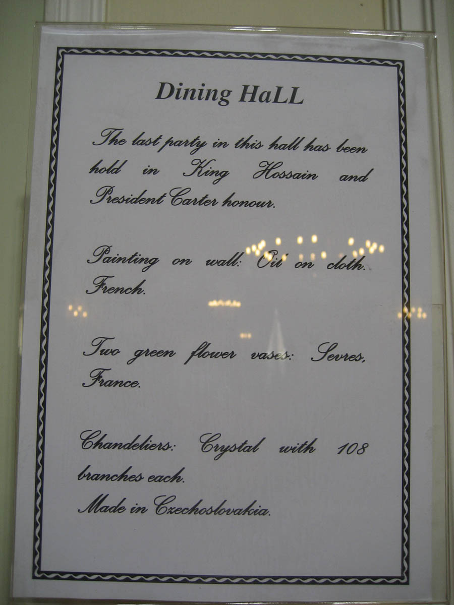 Sign in the hallway of the White Palace noting the last dinner to take place here honored King Hussein of Jordan and President Jimmy Carter.