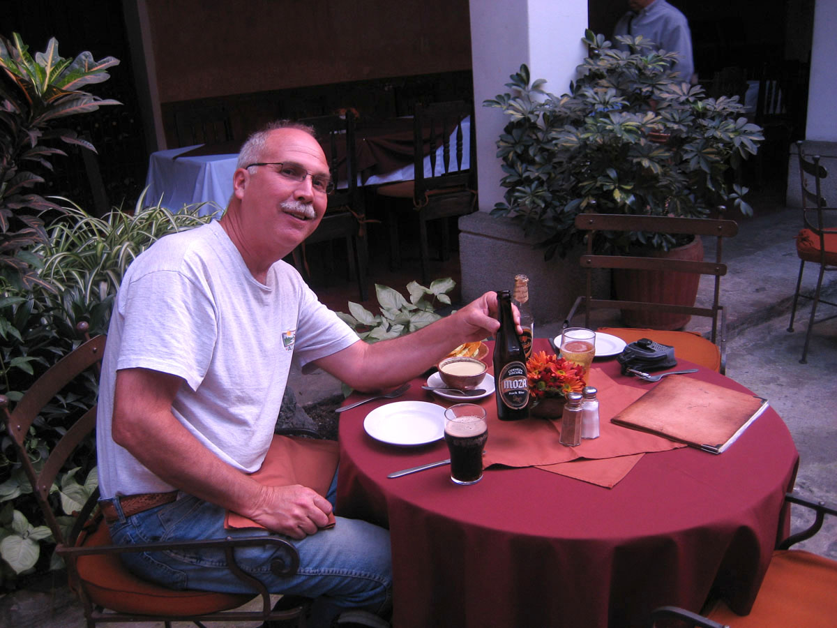 We head to a local courtyard restaurant, La Fonda de Calle Real, where we find our favorite Guatemalan beer, Moza, their famous slogan "Cerveza Obscura."