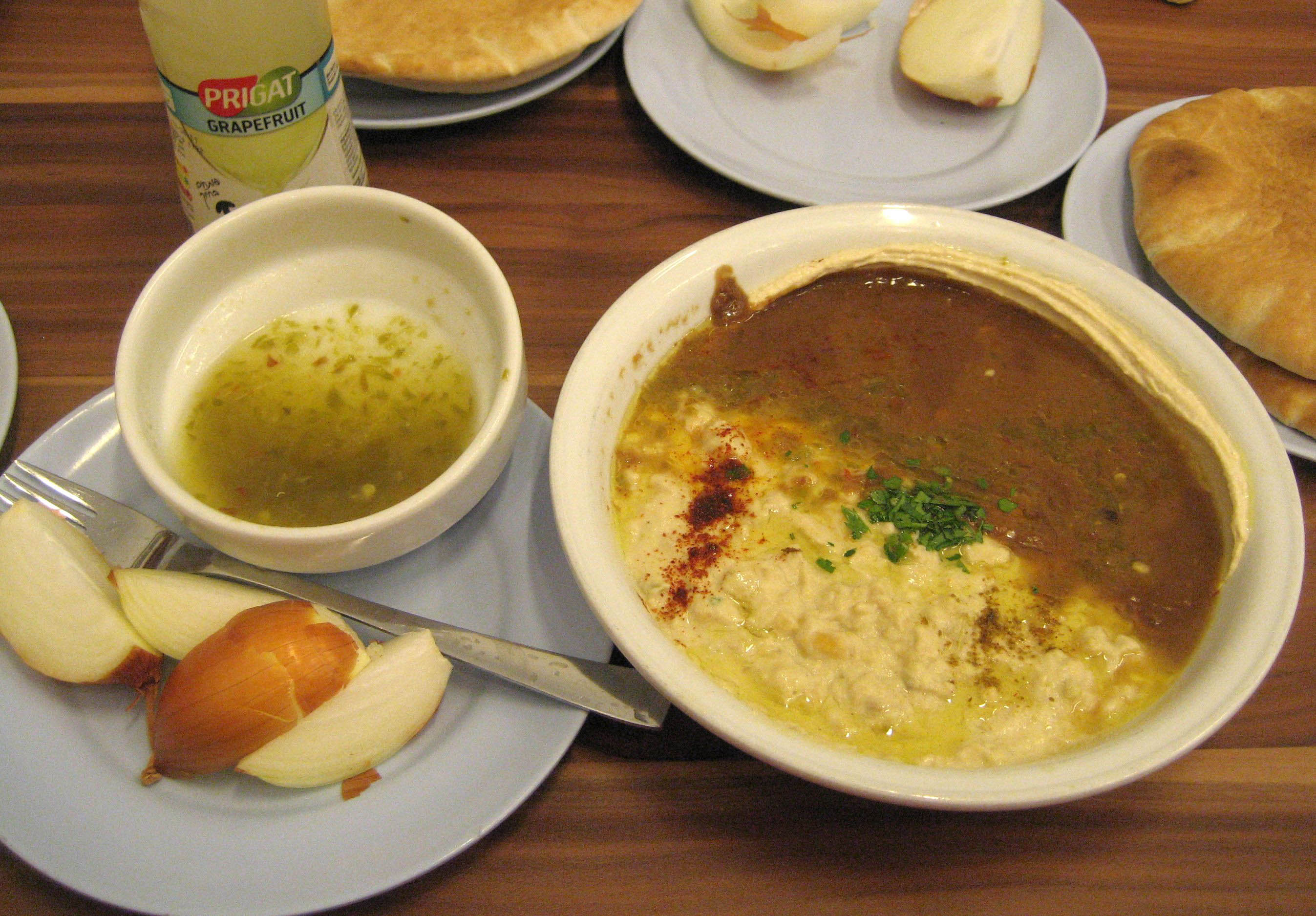 This is the "triple," -- Hummus, tahina (sesame seed paste) and Fuul (chickpea stew) served with spicy pepper sauce. Eyes-roll-back-in-the-head good!!