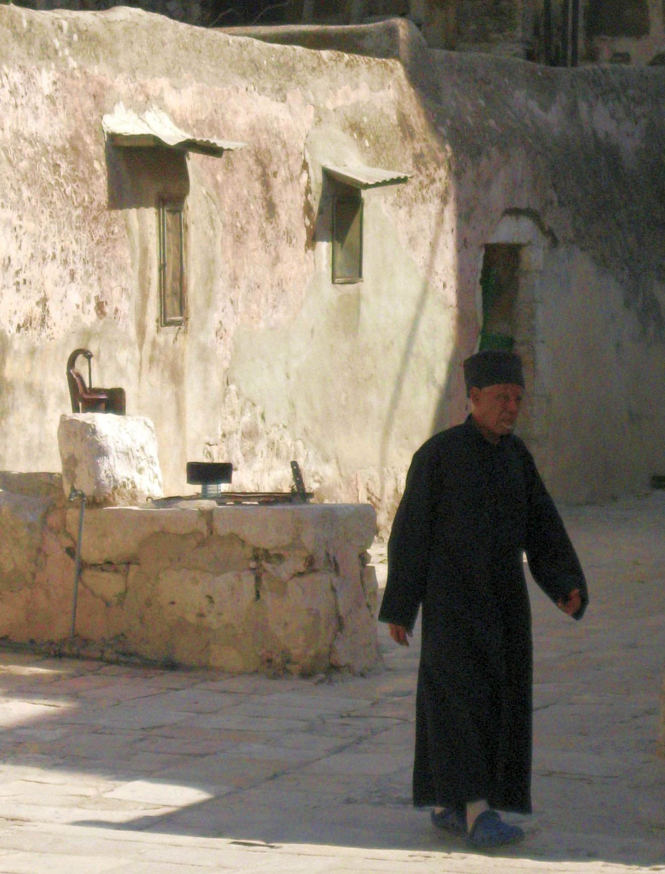 One of the Ethiopian priests walks from the well of the monastery -- gotta love the Crocs!
