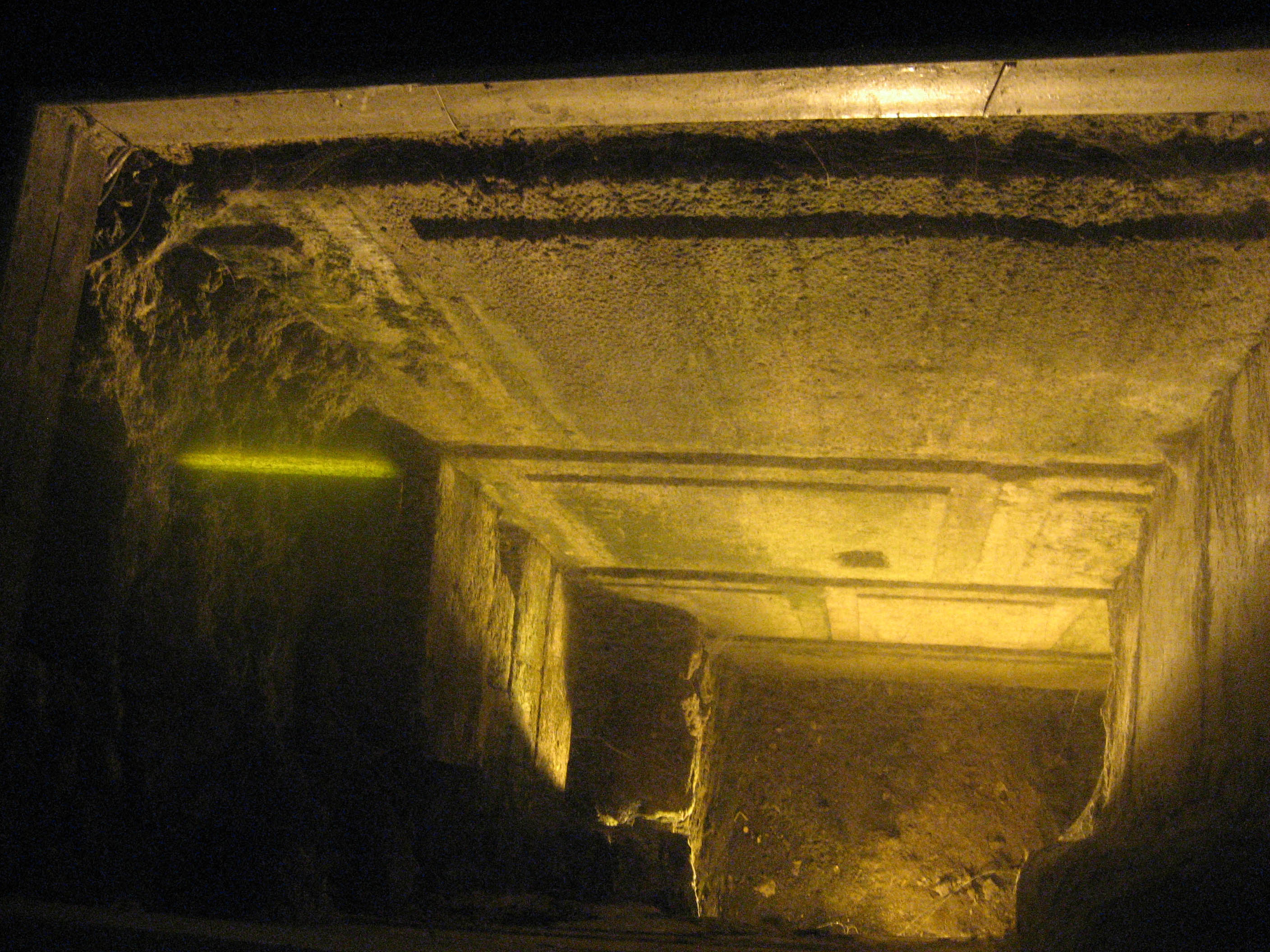 Looking down at the shaft of stone wall which is buried beneath the current street level.