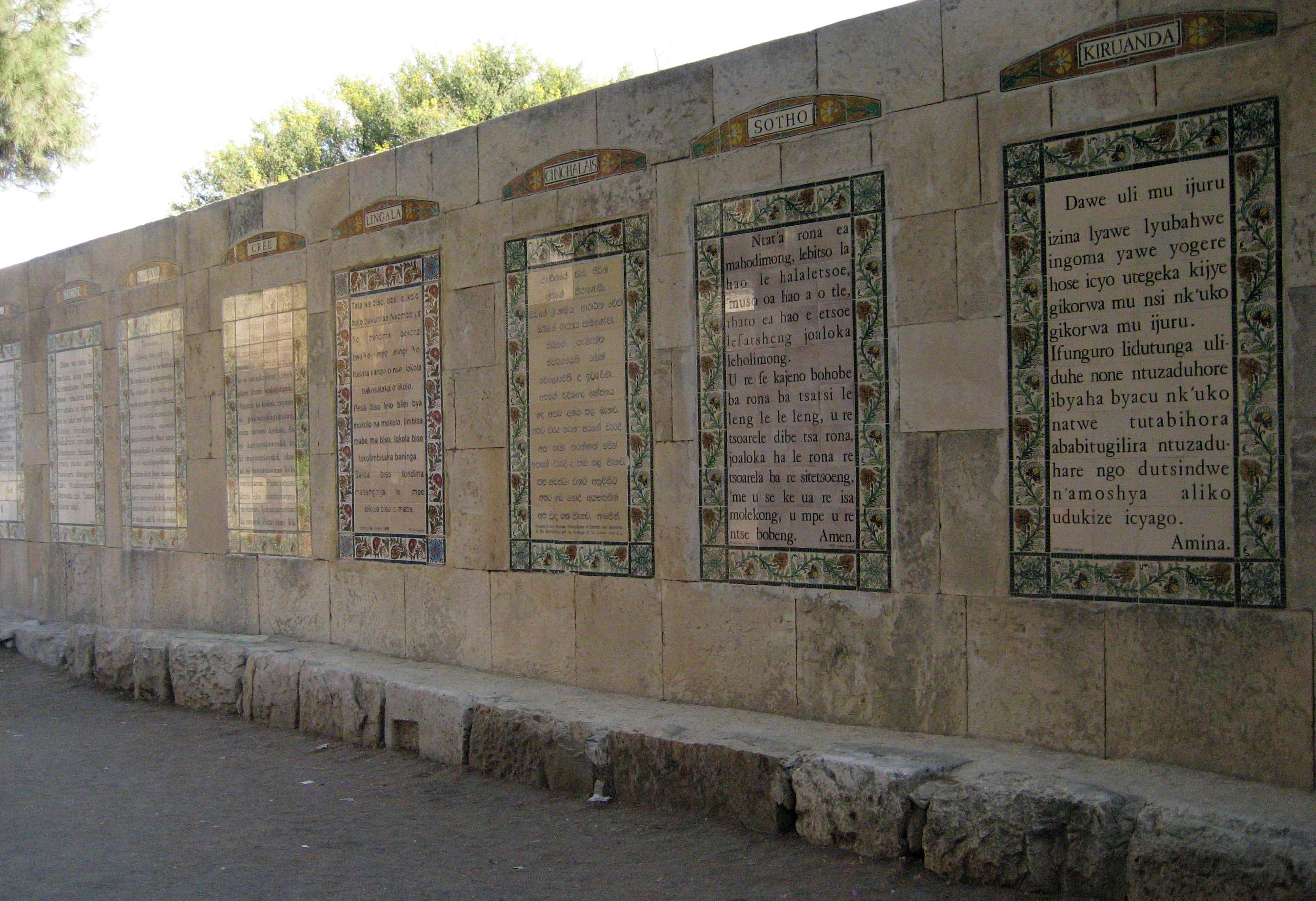 The Church of the Pater Noster has The Lord's Prayer written on huge tiles in over 100 languages surrounding the courtyard. My favorite was Cherokee.