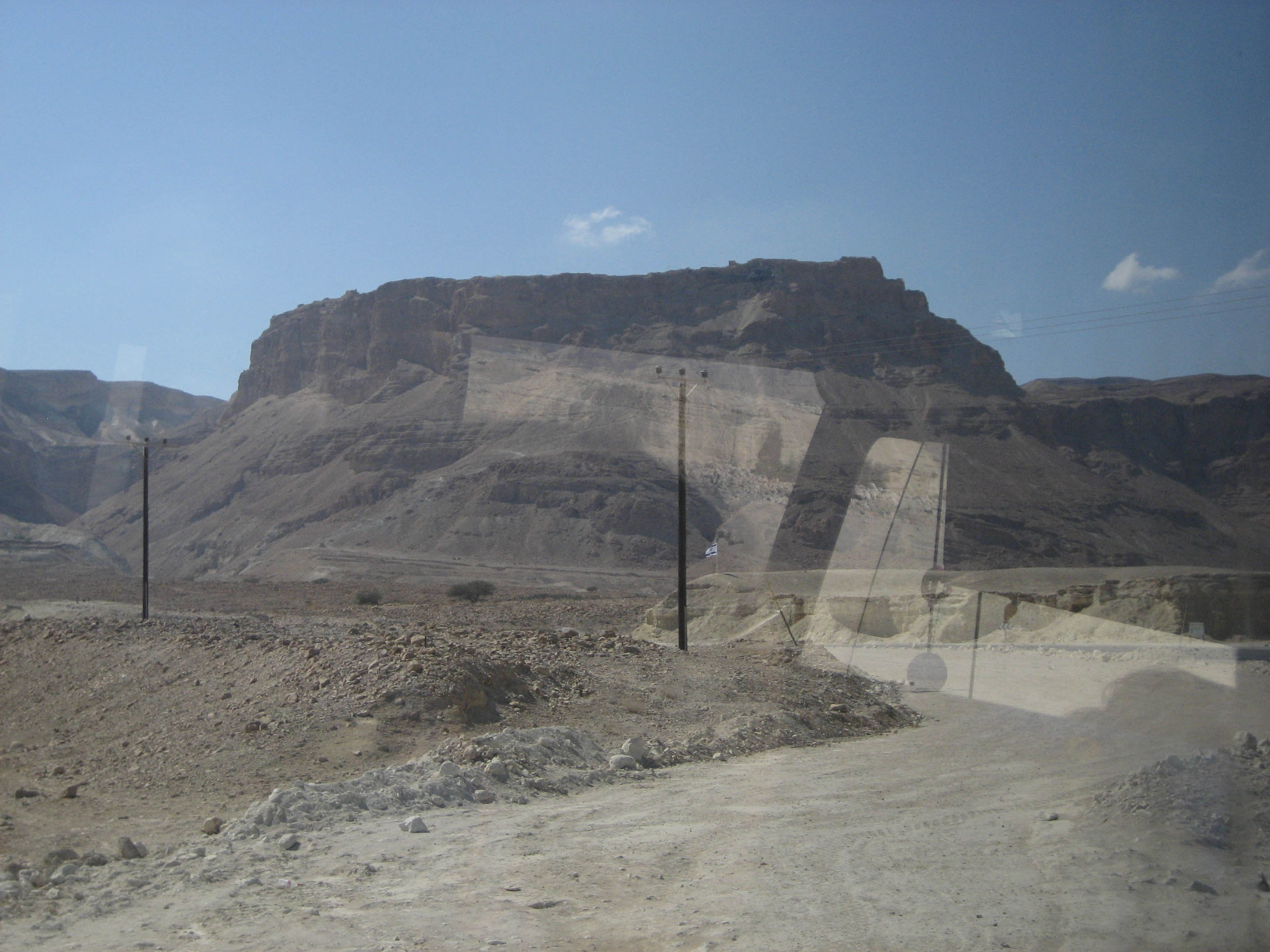A view of the rock plateau, Masada, from the bus window.