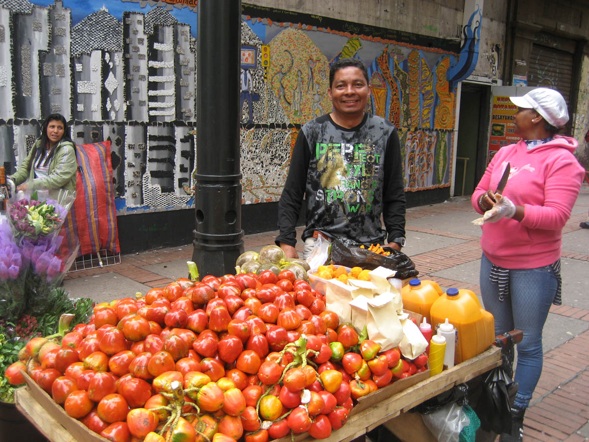 Street graffiti is very common in Bogota, often covering entire blocks with murals. Here, a woman sells "Lulo," a fruit exclusive to this part of South America. A little like a kiwi, only more tart, most commonly served as a refreshing smoothie with ice, sugar, and water.