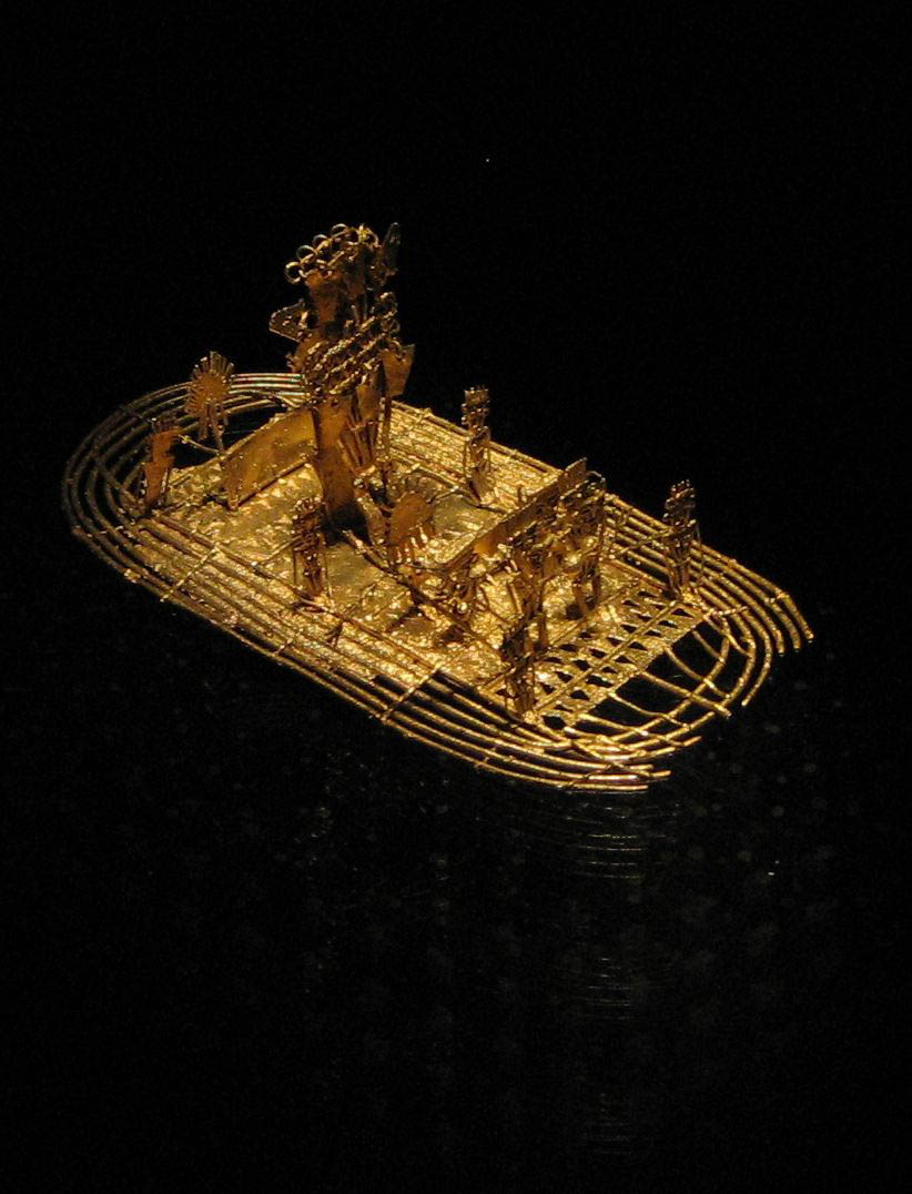 The intricate Muisca Raft, depicting the El Dorado ceremony whereby the chieftain sailed on a raft into the middle of the lake and threw emeralds and gold into the water as offering to the Gods. Believed to be made sometime between 1200 and 1500 AD, found in a cave in 1969.