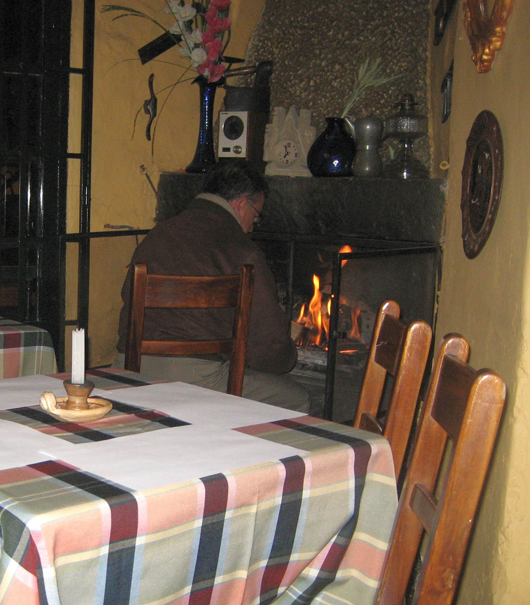 The tiny little candlelit restaurant, "Sanalejo," with a welcomed wood burning fireplace to take the chill out of the air.