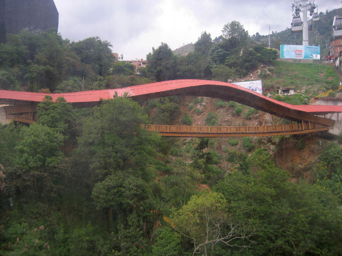 A beautiful bridge leads to the black structure on the left, the Biblioteca Espana, or Library of Spain.