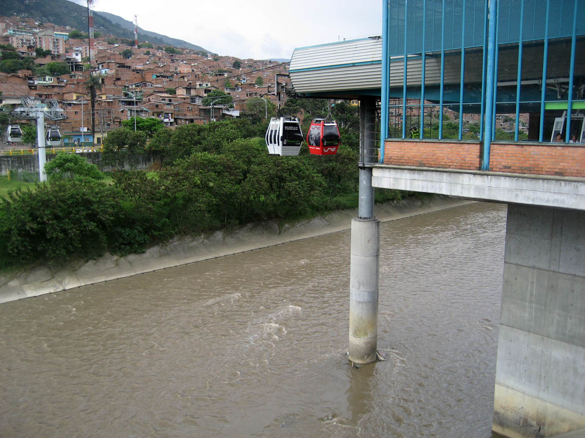 This Metrocable station is cantilevered out over the Medellin River.