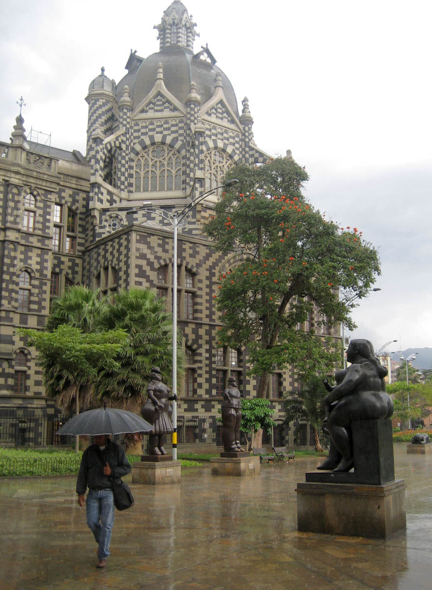 I go to Parque Berrio to view some of Botero's famous sculptures, but have to wait under the subway overpass until the rain lets up. Good vantage point to admire the Palacio de la Cultura Raphael Uribe Uribe, the back and white building in the park.