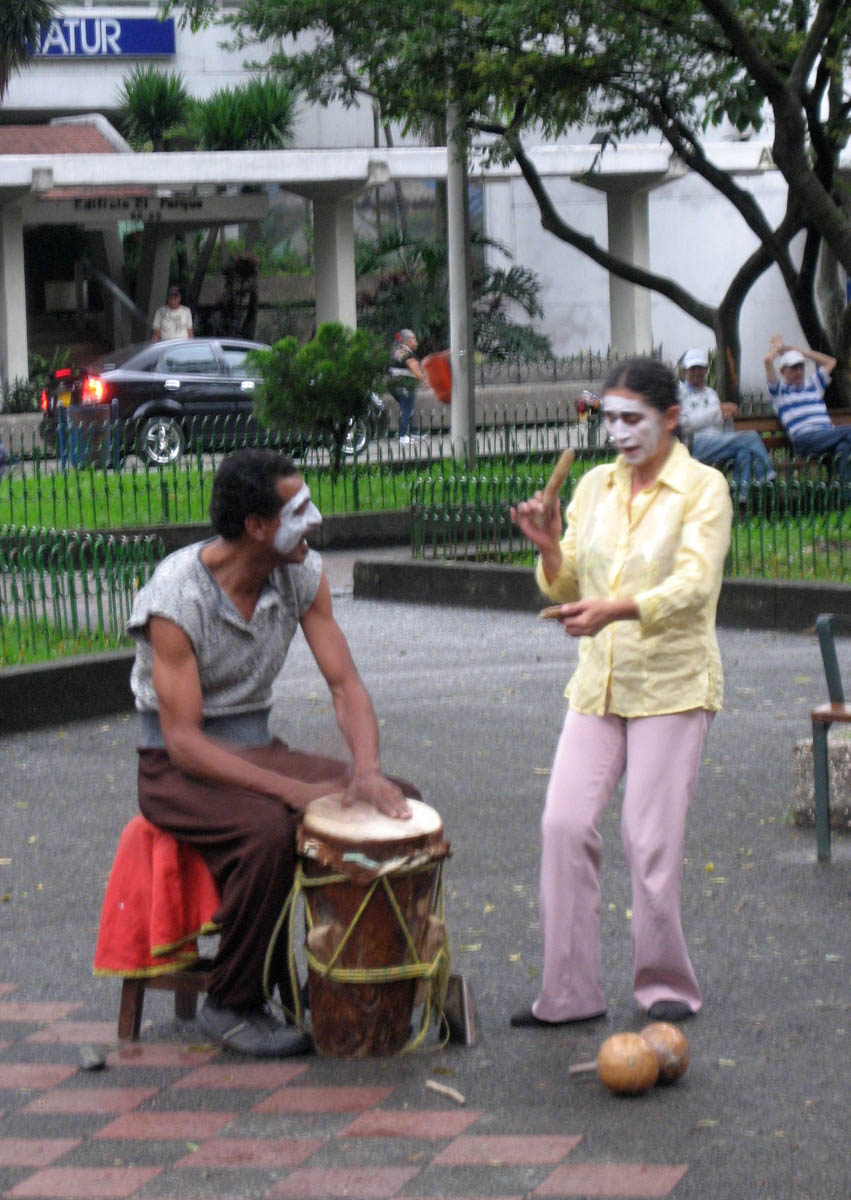 Street performers come out as soon as the rain stops. Parque de Bolivar, Medellin.