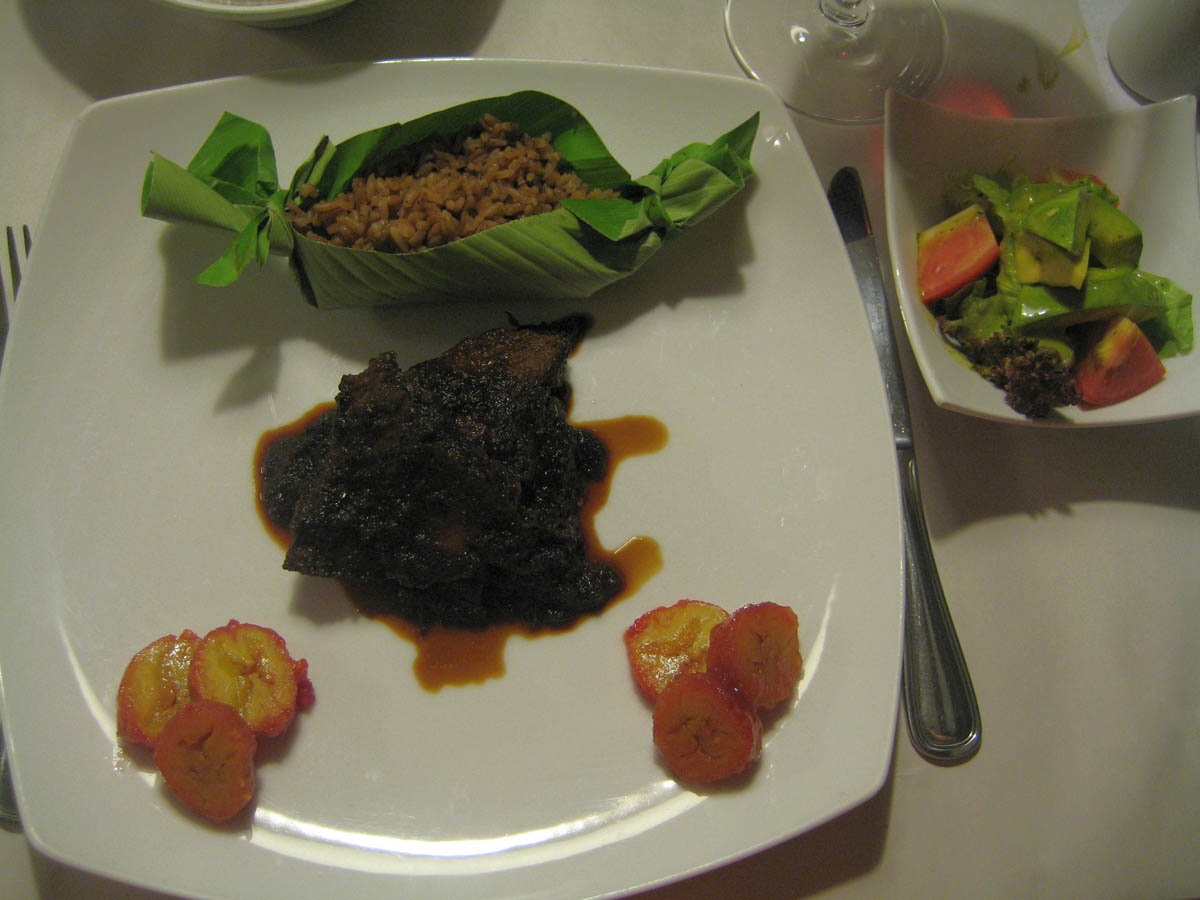 The main course was "Obatala," a traditional costena beef stew, made with tender beef and caramelized onions, paired with a Cabernet. In the little green banana boat was rice in sweetened coconut milk. Divine!