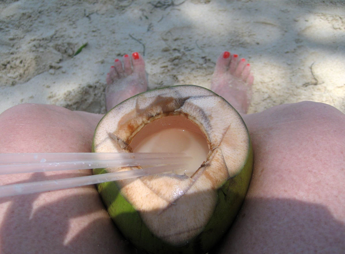 The only problem with drinking out of a coconut is that it has no "bottom," so you have to drink the entire thing before you can set the coconut down!