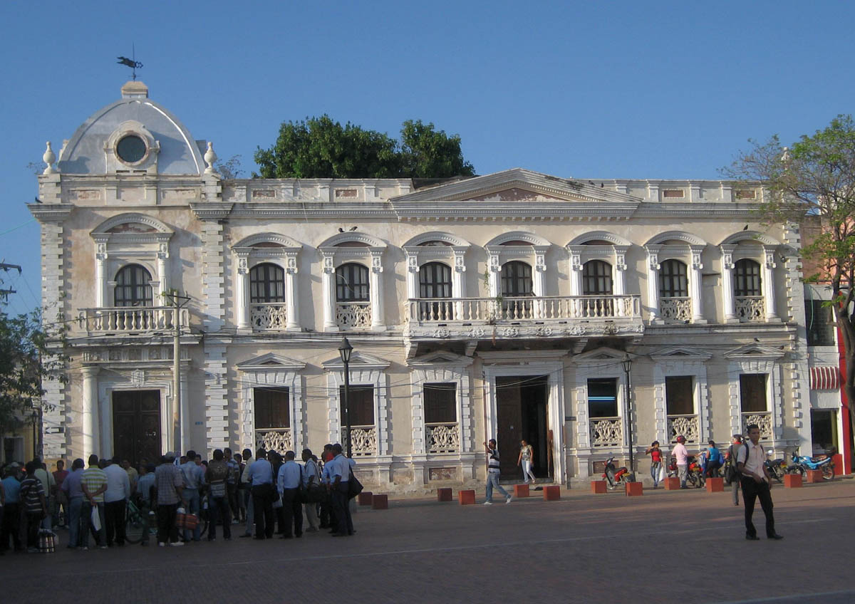 Santa Marta also has a good bit of colonial architecture, much of it under restoration. This building lines the Cathedral square. The crowd outside was watching a game of bowling, using stacked plastic cups and a soccer ball.