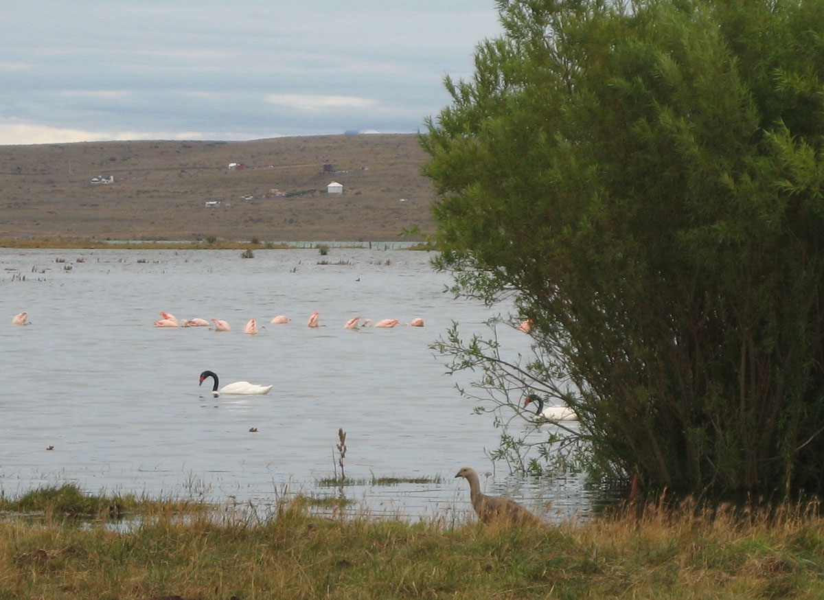 Pink flamingos, swans, and other water fowl on the Laguna Nimez Reserve on the shores of Lago Argentina.