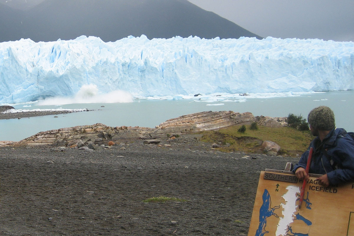 Luis has to stop his orientation because he cannot compete with the show behind him as the glacier calves, making a big splash.