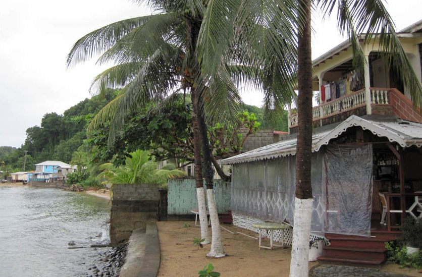 This is the little waterside "coral Reef Restaurant" in Calibishie. It is typically open to the sea, however they are coated in plastic today to keep out the sheets of rain.