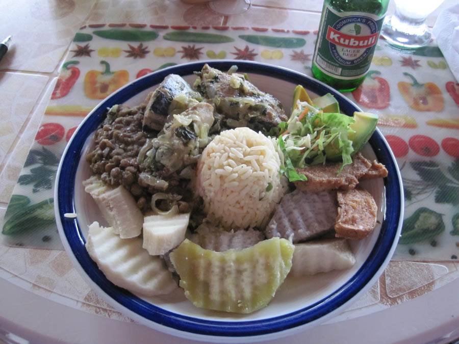 My lunch at Coral Reef Restaurant - Clockwise: Avocado and salad, fried potato, dasheen (speckled one) sweet potato (green one,) yam (white one,) plantain (banana-looking one) lentils, greens, and stewed fish, with rice in the center.