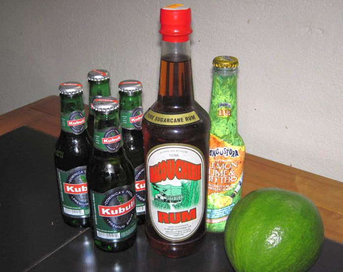 Here was my haul from my shopping spree -- Kubuli Beer, ("Dominica's pride!") Macoucherie Rum, distilled locally, and some Lemon Lime with bitters mixer.