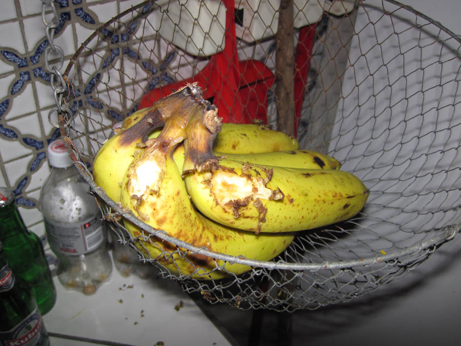 They say don't leave fruit out with the windows open, as birds have figured out how to fly in and have a snack. I thought mine were safe in the hanging wire basket, but that obviously just added a little adventure to their challenge.