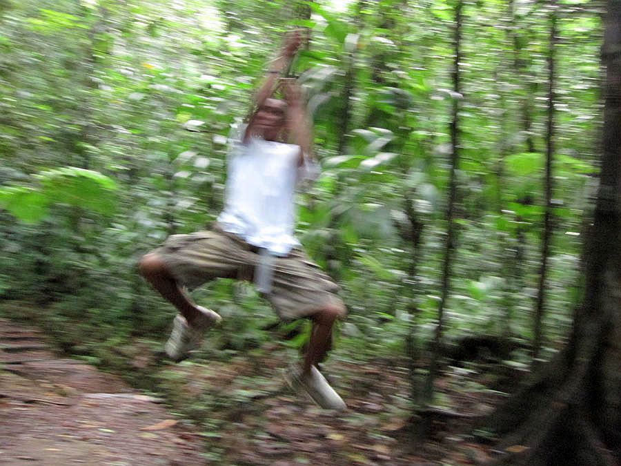 Most of the falls suggest you go with a local guide, because they require crossing rivers and some "bouldering." My young guide Nathan is demonstrating the "Tarzan vines" hanging from the trees.