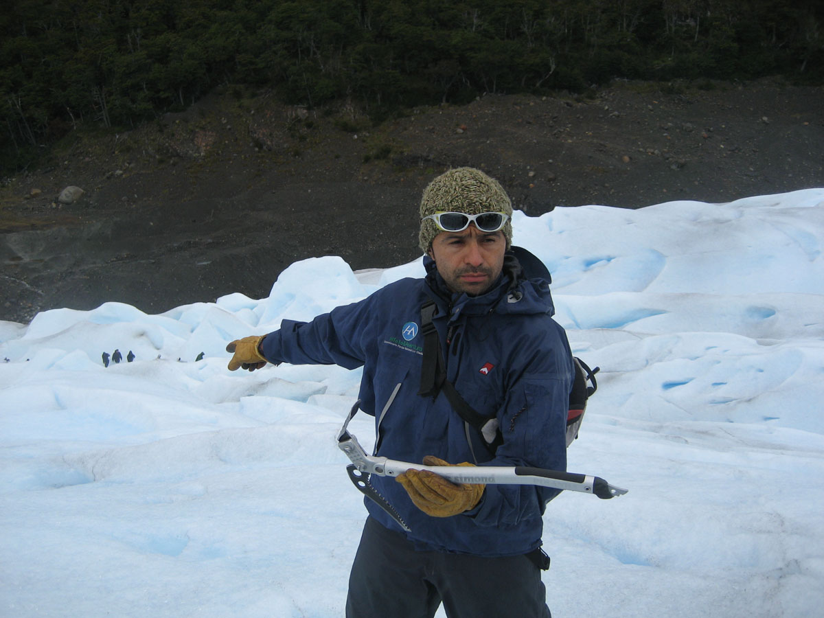 Luis uses his ice axe to demonstrate how the glacier is formed