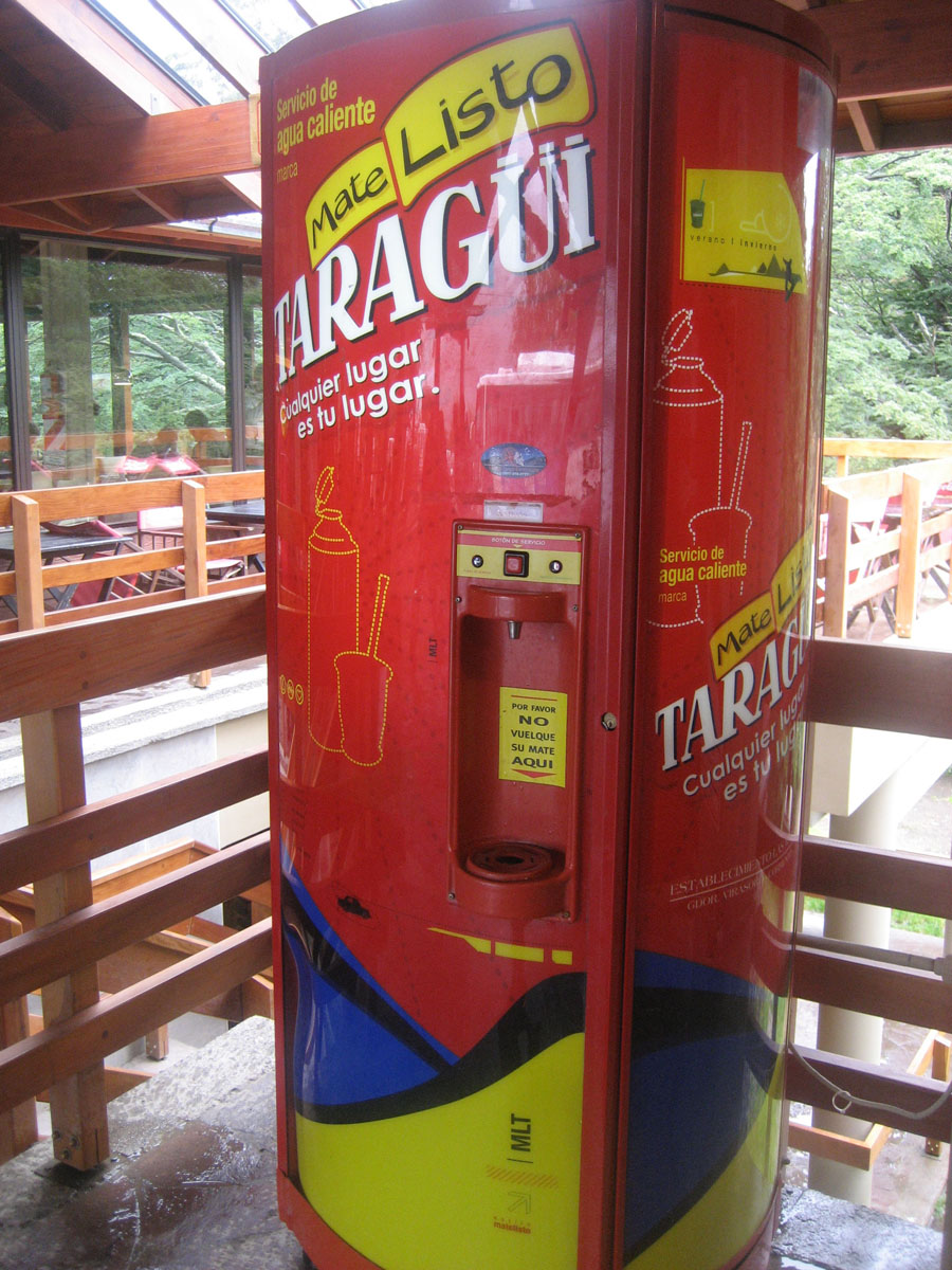 This vending machine provides hot water for the national drink, "Mate'" which is an herbal infusion, sipped from a gourd through a perforated hollow silver straw.