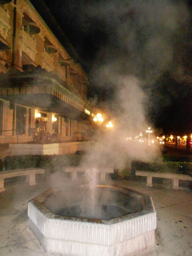 Steam rises up from natural hot springs fountains along Bathhouse Row.