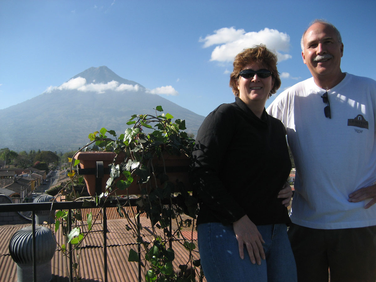 Self-timed photo from the hotel rooftop of the view of the famous landmark in Antigua to the South, Aqua Volcano, over 12,000 ft high always making navigation in the city easy (at least on a clear day!)